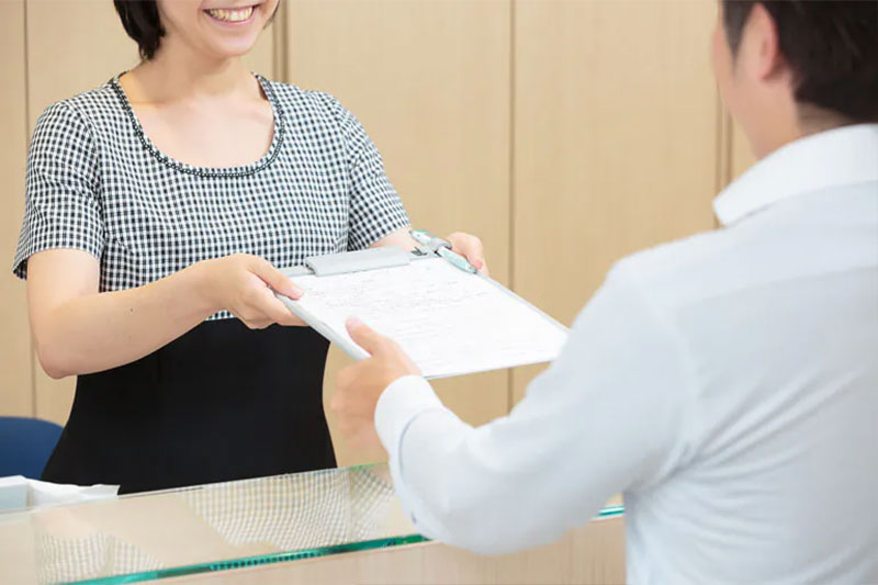 ご予約いただいた日時の少し前にご来院いただき、受付にお声掛けください。 お名前を伺って、保険証をお見せいただき、診療についてのご説明をさせていただきます。 その後、問診票をお渡ししてご記入いただきます。