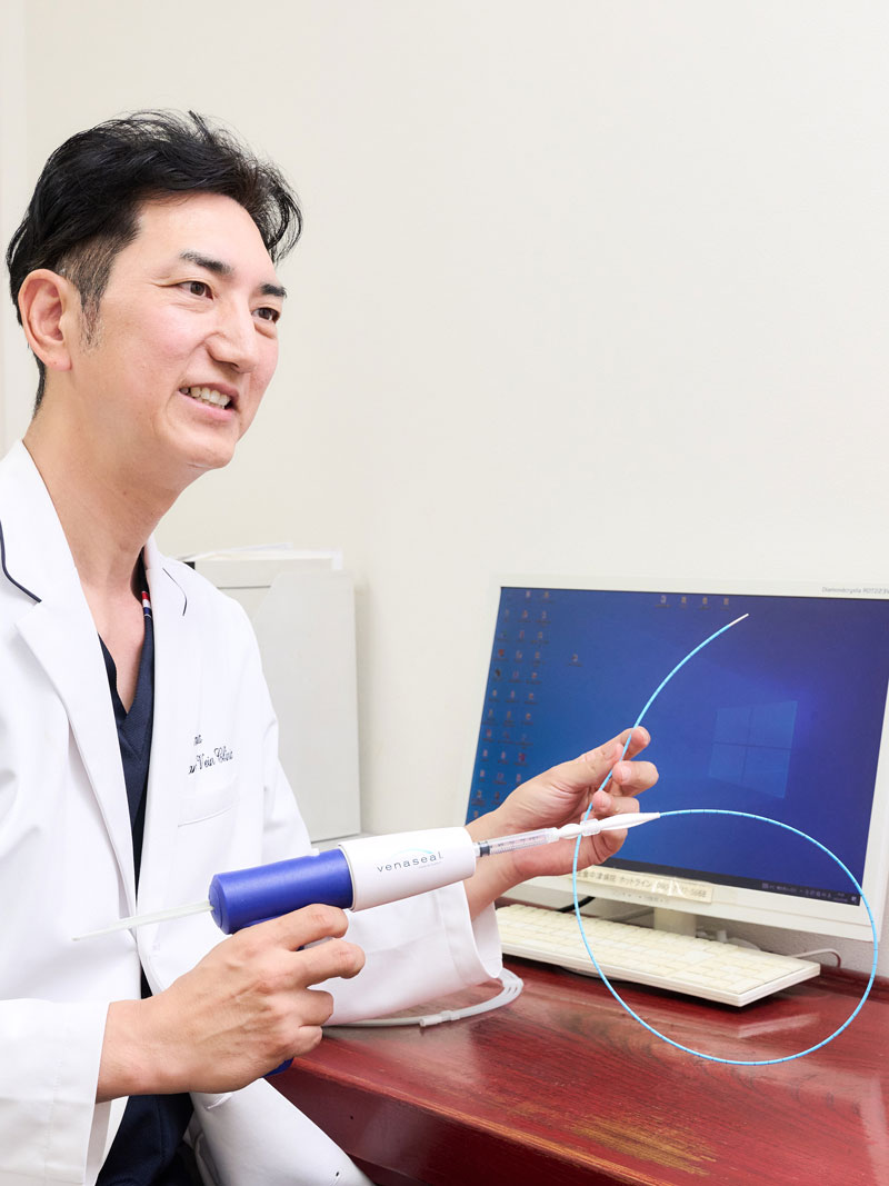 血管内塞栓術(グルー治療)は、血管内焼灼術(レーザー・高周波治療)のような熱を用いずに治療できるので、血管周囲の組織や神経に損傷を与える危険性がありません。そのため、TLA麻酔も必要なく、カテーテルを挿入する部位のみに局所麻酔をするだけです。また、治療後は弾性ストッキングを着用する必要もありません。